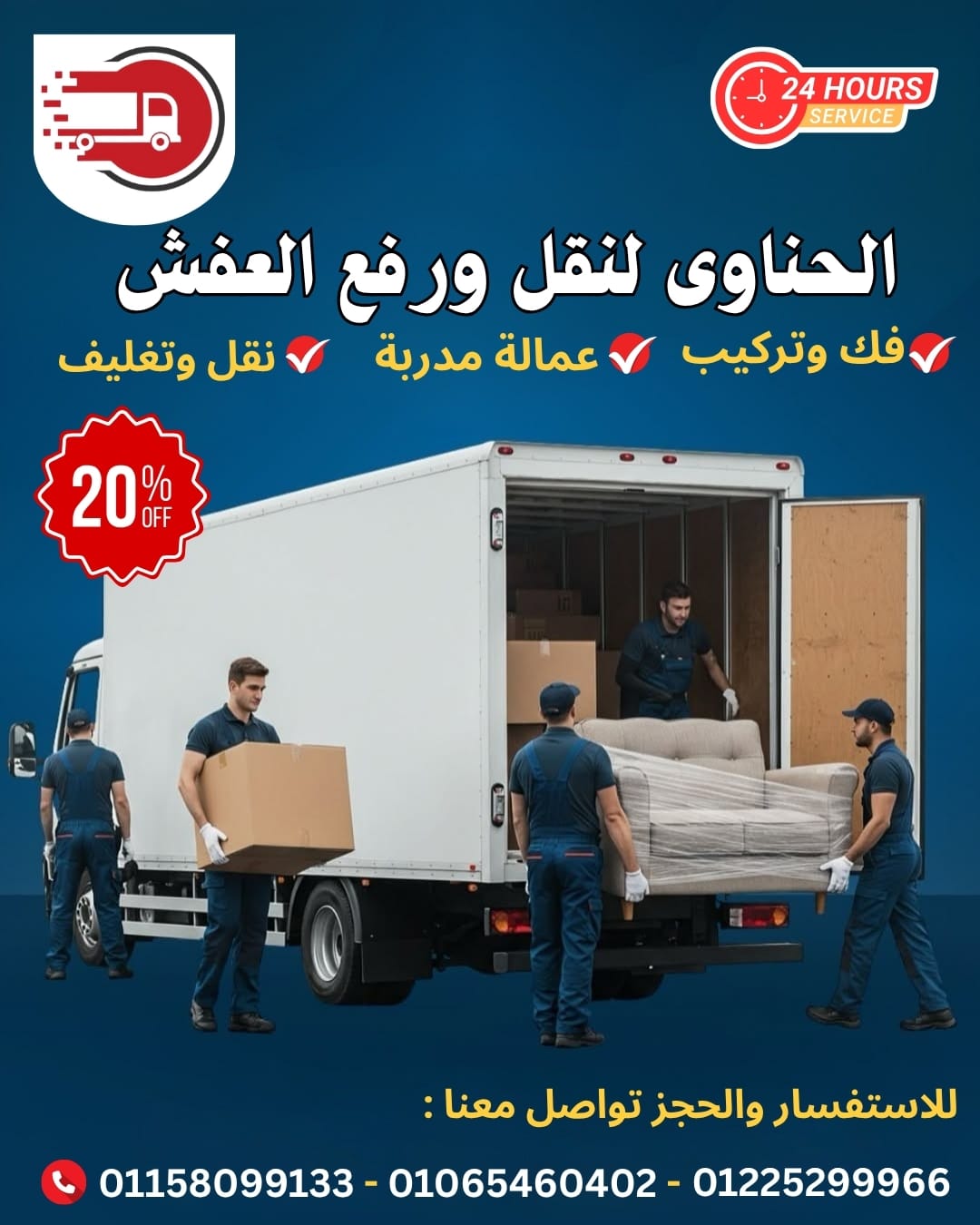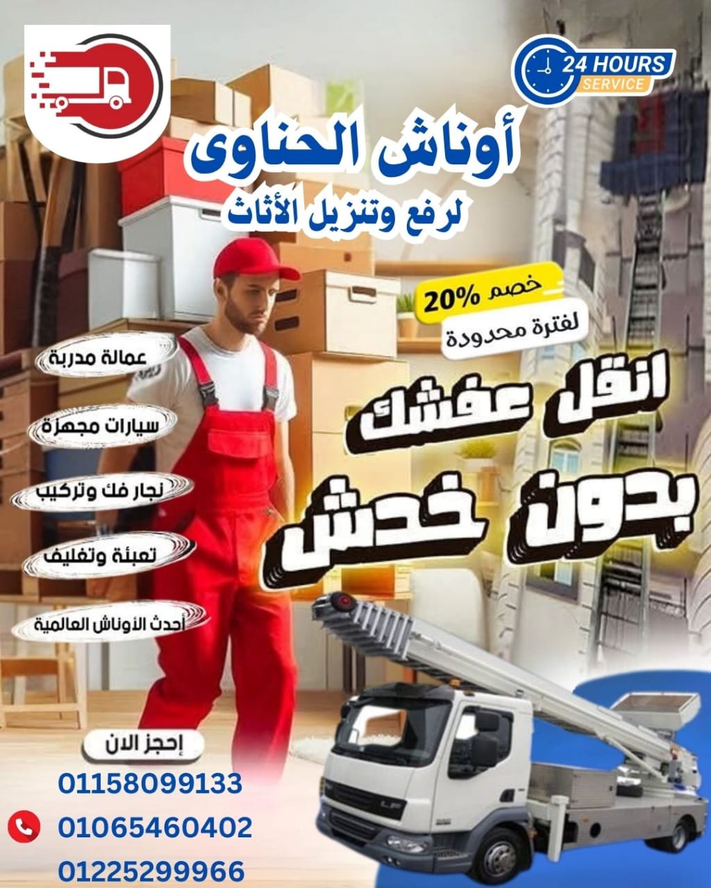 تقدم شركة الحناوي في القاهرة والجيزة خدمات متكاملة تشمل فك وتركيب وتغليف الاثاث و شحنه في احدث سيارات لنقل العفش عن طريق فنيين محترفين على اعلى مستوى مع ضمان شامل ضد الكسر او الخدش بأرخص الاسعار في السوق